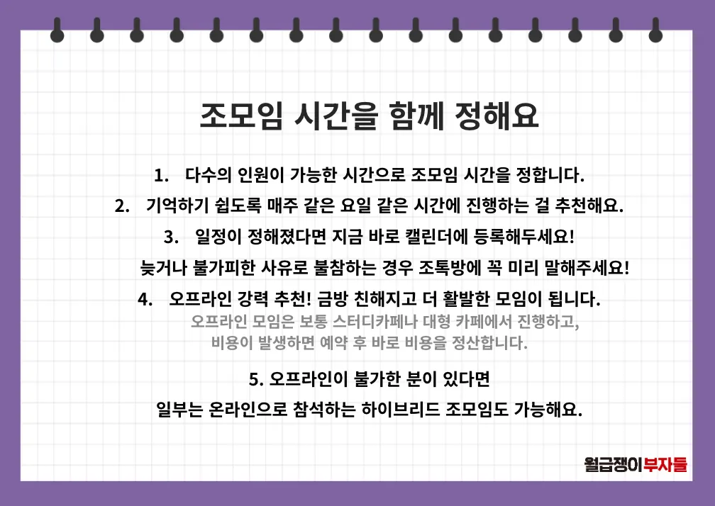 일자와 시간은 가장 다수가 가능한 시간으로 결정합니다. 부득이하게 그 때 참여 못하시는 한두분이 계시다면 내용을 정리하여 톡방에 전달해주세요!