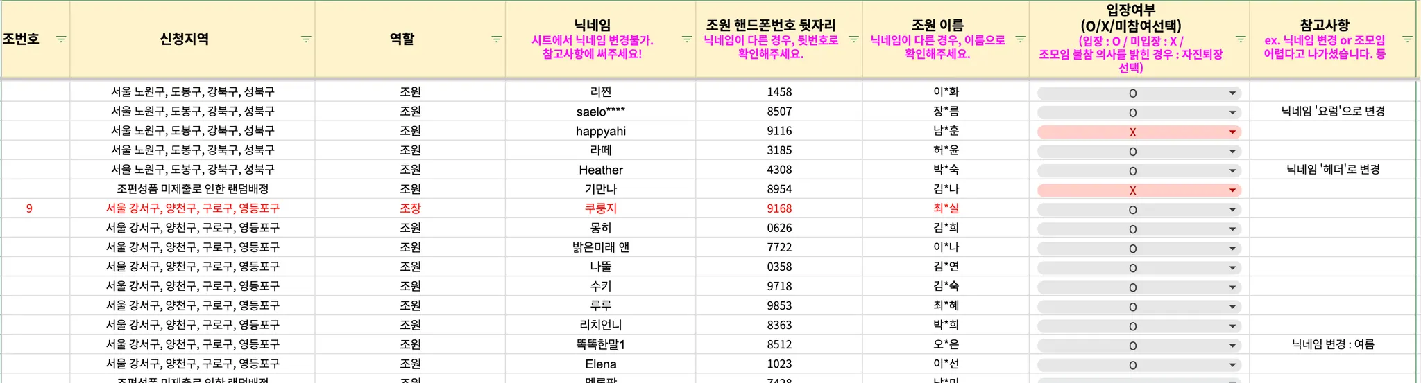우리 조원분들은 조장시트에서 확인할 수 있어요 (조장시트는 조장톡방 공지에 있습니다)