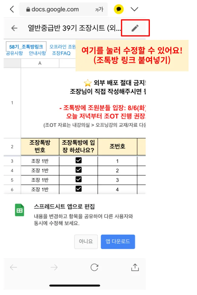 3. 만드신 조톡방(오픈채팅방) 링크는 복사하여 조장시트에 붙여넣기 주세요