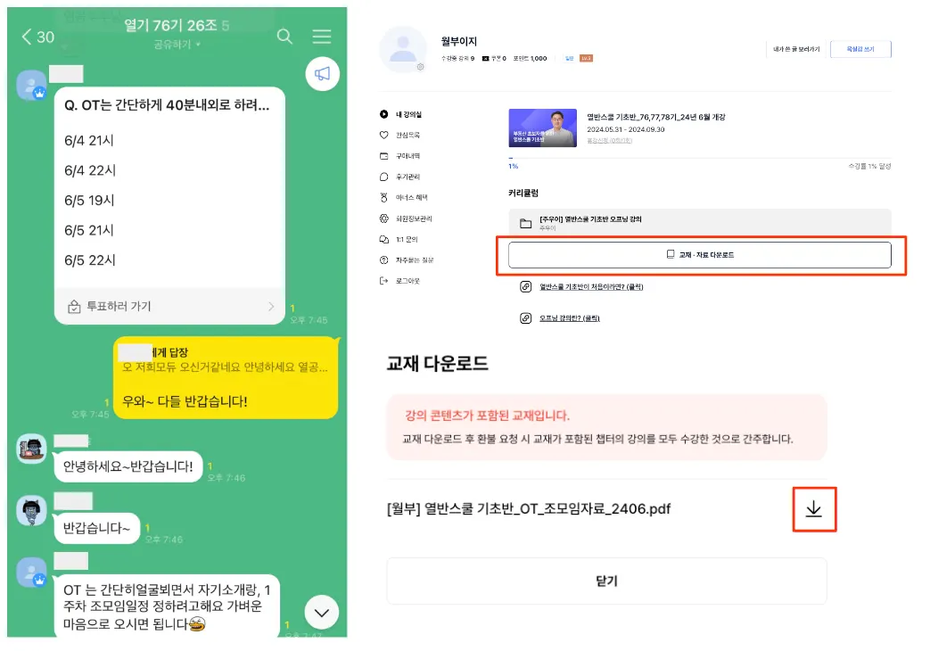 (자료는 저녁 18시에 업데이트 예정) 내강의실-오프닝강의 밑에 [교재자료다운로드] 부분에 조OT 에서 활용하실 PPT를 미리 확인하실 수 있습니다. (아래 이미지 참고)이 자료의 순서대로 OT가 진행될 예정이니, 미리 조톡방에 공유하고 보고 오시면 좋습니다.